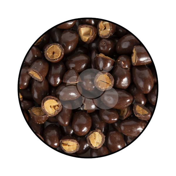 Maní bañado en chocolate semi-amargo.